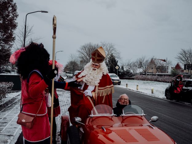 Maandag 4 december kregen we bezoek van Sinterklaas en maar liefst 5 Pieten. Als een echte Max Verstappen kwam de Sint in een rode, snelle. open auto aangereden (nou vooruit.. hij reed niet meer zelf, maar werd gereden) en is vervolgens de hele dag gebleven om alle groepen en de peuterzaal te bezoeken. Hij heeft na schooltijd zelfs nog met ons geluncht.